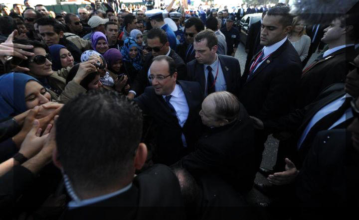 A sa sortie de l'Elysée, François Hollande est acclamé par la foule vraisemblablement remplacée par les services du parti socialiste. Il fait arrêter la voiture, descend et va serrer des mains.